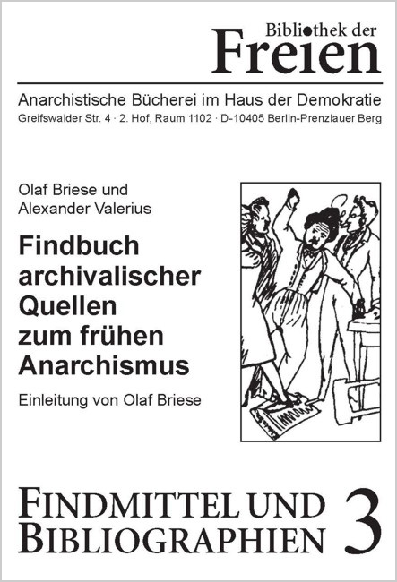 Findbuch archivalischer Quellen zum frühen Anarchismus. Beiträge zur Erschließung von Akten aus Berliner Archiven über die „Freien“ (1837-1853). Hrsg. von Olaf Briese und Alexander Valerius, Bodenburg: Verlag Edition AV, 2021, Paperback, 372 Seiten, 978-3-86841-273-4,18,00€ [Direktkauf bei aLibro]